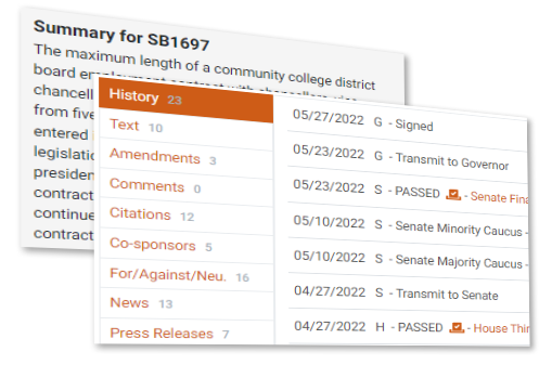 Easily monitor legislation for clients. Access the quickest source of proposed and actual changes to laws. Conduct historical research on statute change. Your best bet for determining legislative intent and history. Expand your government affairs reach.